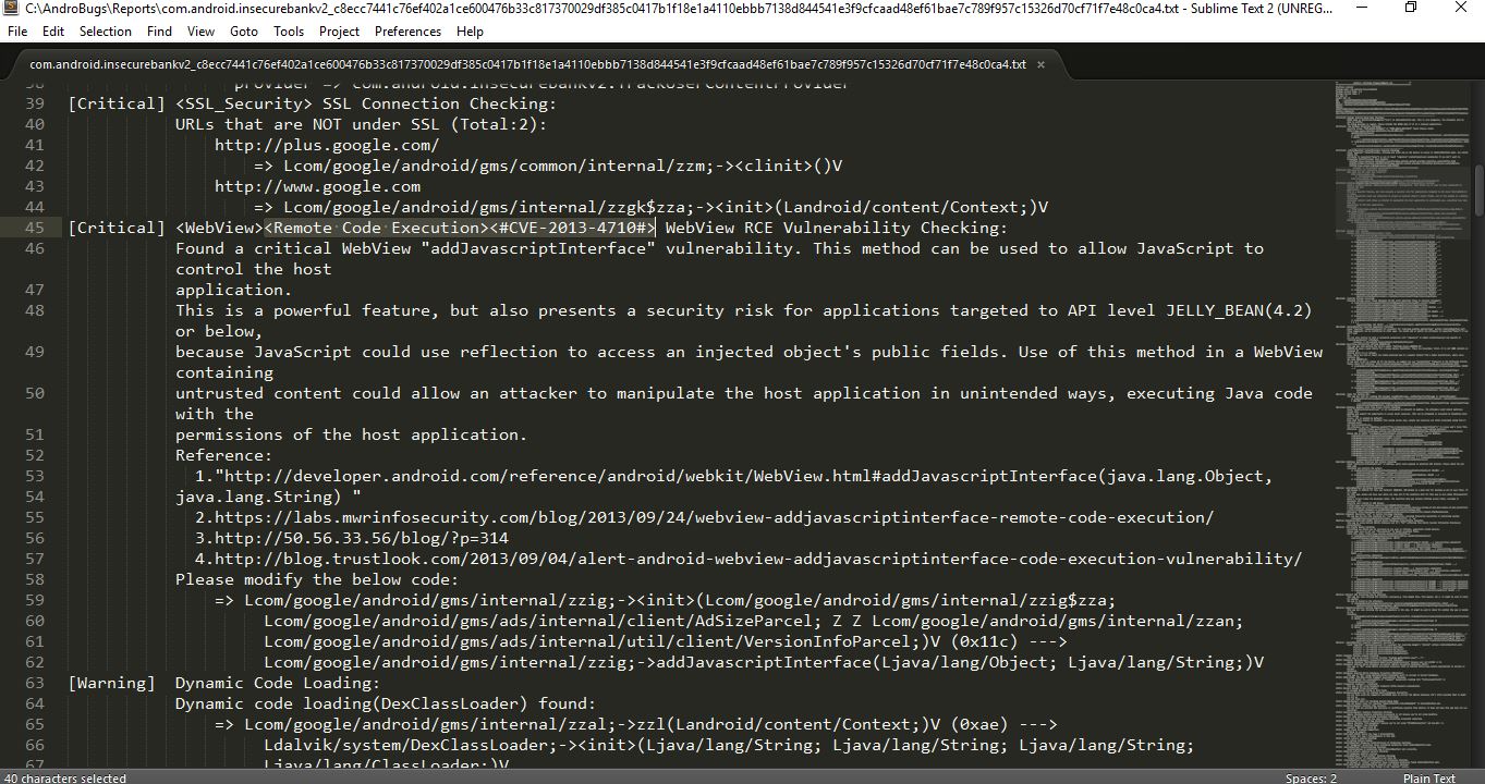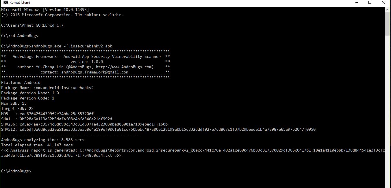 Kullanımı oldukça basittir. Konsol üzerinden biz androbugs -f apk_dosyasi şeklinde kullanarak frameworkumuzu çalıştırdık. Bunun sonucunda kendi klasörünün altında Reports klasörünün altında detaylı rapor oluşturmaktadır.