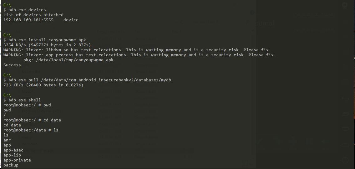 Simülatör (sanal cihaz) ya da bilgisayarınıza bağlı gerçek cihazınızla iletişim kurulmasını sağlar. Bu sayede bağlanılan cihazı komut satırında kullanabilir, dosya yükleyebilir, cihaz içinden dosya çekebilir, hatta uygulama içinde bulunan Activityleri çalıştırabiliriz. Temel kullanımı aşağıdaki gibidir. canyoupwnme.apk dosyasını yükledik. InsecureBankv2 uygulamasının veritabanı dosyasını çektik ve adb shell komutu ile cihazımızın komut satırına düştük. Daha detaylı adb için tıklayınız.