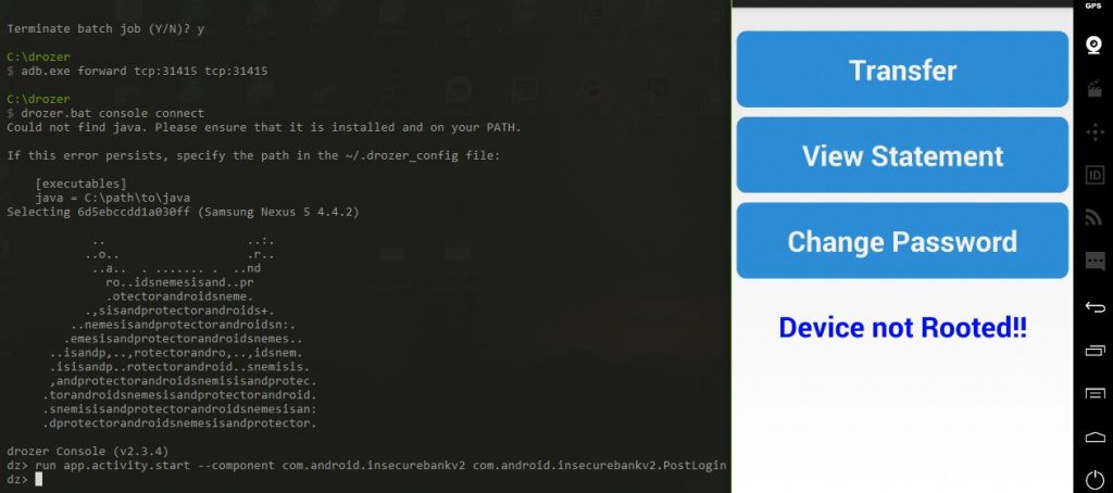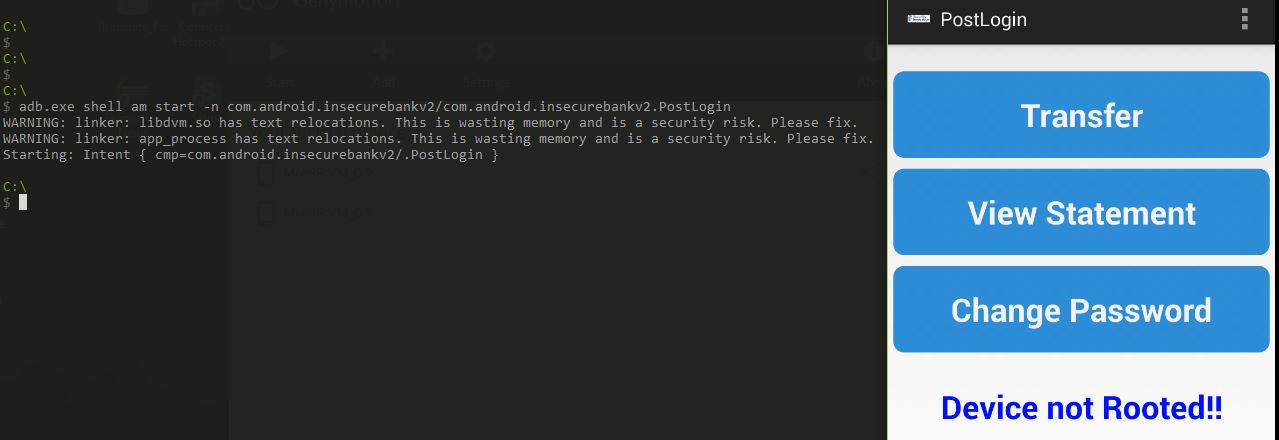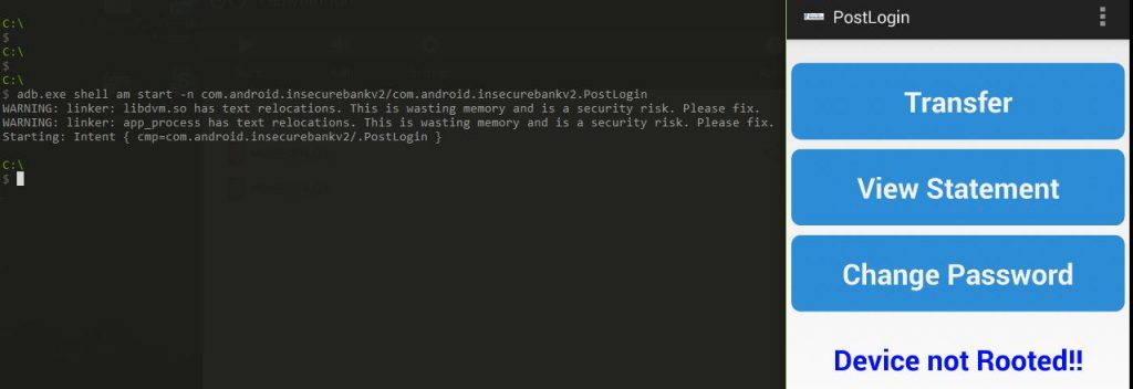 Bu activity i drozer ile çalıştırdığımız gibi ADB ile de çalıştırabiliriz. adb.exe shell am start -n com.android.insecurebankv2/com.android.insecurebankv2.PostLogin komutu ile aynı işlemi gerçekleştirebiliyoruz.