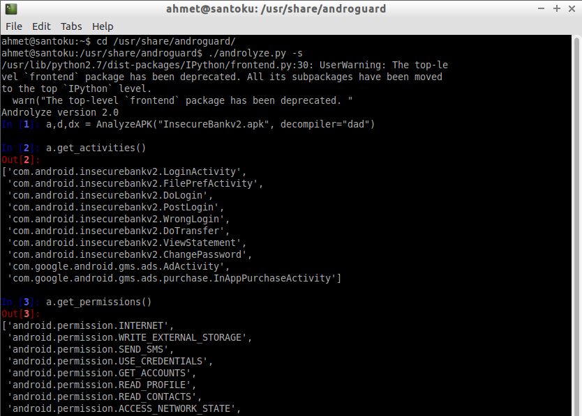 AmdroGuard Santoku üzerinde bu şekilde çalıştırılmaktadır. İlk olarak kurulu olduğu dizine gittik ve apk dosyamızı da oraya taşıdık. ./androlyze.py -s ile çalıştırdık. İlk satırımıza a,d,dx= AnalyzeAPK(“Insecurebankv2.apk”, decompiler=”dad”) komutunu yazarak apk dosyamızı göstererek decompile ediyoruz. Daha sonra programın parametreleri ile birçok analiz edebilmekteyiz. Resimde uygulamanın activitylerini ve izinlerini getirdik.