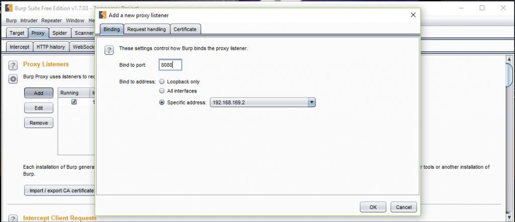Burp Suite açarak, Proxy’e tıklayıp, oradan Options sekmesine gelip, Add e basıyoruz ve resimdeki gibi kendi IP adresinizi ve port numaranızı giriyorsunuz.