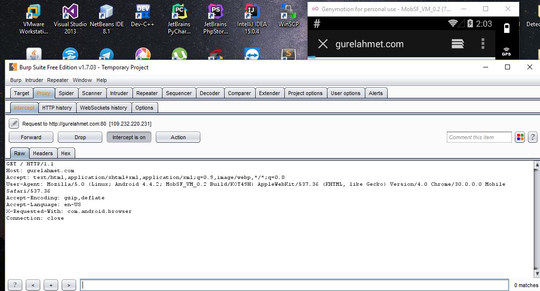 Artık Burp Suite hazır mobil testimizde kullanabilirsiniz. Resimde gördüğünüz gibi emulatordeki isteği yakalamakta.