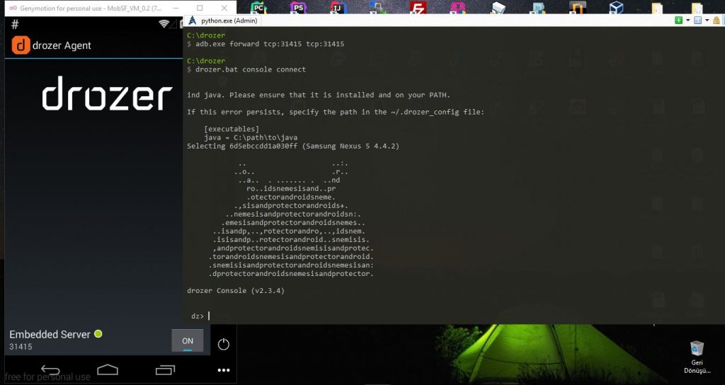 Drozerda mobil testlerde kullanılan dinamik analiz yapan bir frameworktur. Uygulama çalışırken test etme imkanı verir. Diğer AndroBugs ve MobSF de ise statik analizi yaptık fakat uygulama çalışmıyordu. Drozer’da uygulama çalışırken testlerimizi gerçekleştiriyoruz. Drozer’ı kendi test pc nize kurduktan sonra aynı zamanda emulatordeki mobil cihaza da yükleyerek birbirleri ile haberleşmesini sağlıyoruz. Buraya tıklayarak kaynak kodlarına ve kurulumuna ulaşabilirsiniz. Kendi test pc nize drozeri kurduktan sonra agent.apk yı emulatore atmayı unutmayınız. Bunu ister sürükle bırak ile istersenizde adb. install agent.apk komutu ile yapabilirsiniz. Yükledikten sonra agent.apk yı emulatorde açarak off dan on a alınız. Daha sonra kurulum sayfasında gösterdiği gibi adb forward tcp:31415 tcp:31415 komutunu verip drozer console connect diyerek drozerin komut satırına düşebilirsiniz.