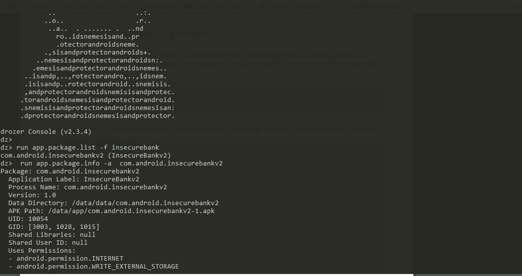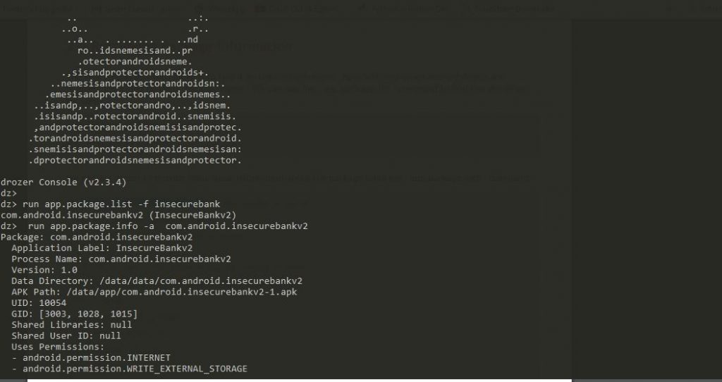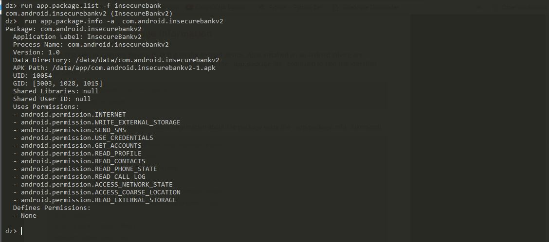 Yukarıdaki resimlerde gördüğünüz run app.package.info -a com.android.insecurebankv2 komutu ile paket bilgilerini getirdik. Bulunduğu dizin, izinleri gibi bilgiler geldi.