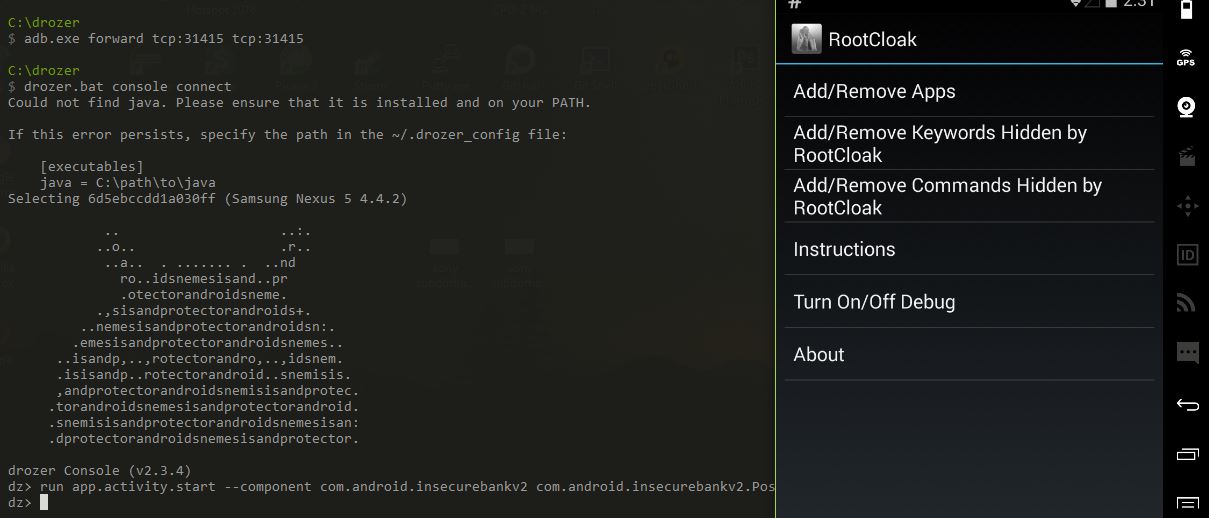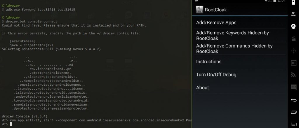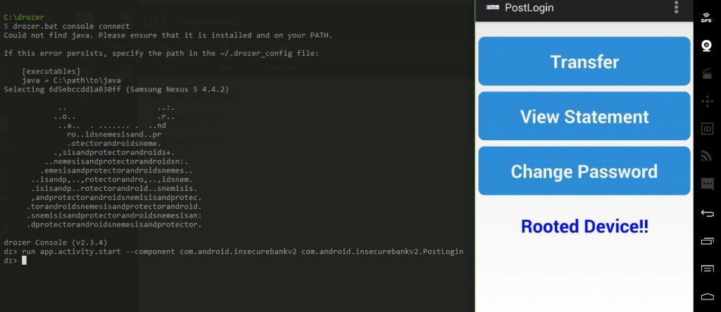 Drozer in komut satırında run app.activity.start –component com.android.insecurebankv2 com.android.insecurebankv2.PostLogin komutunu çalıştırdığımızda dediğimiz işlemi gerçekleştirmiş oluyoruz.