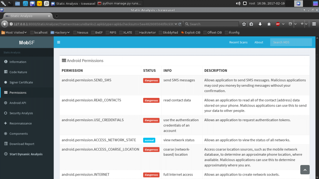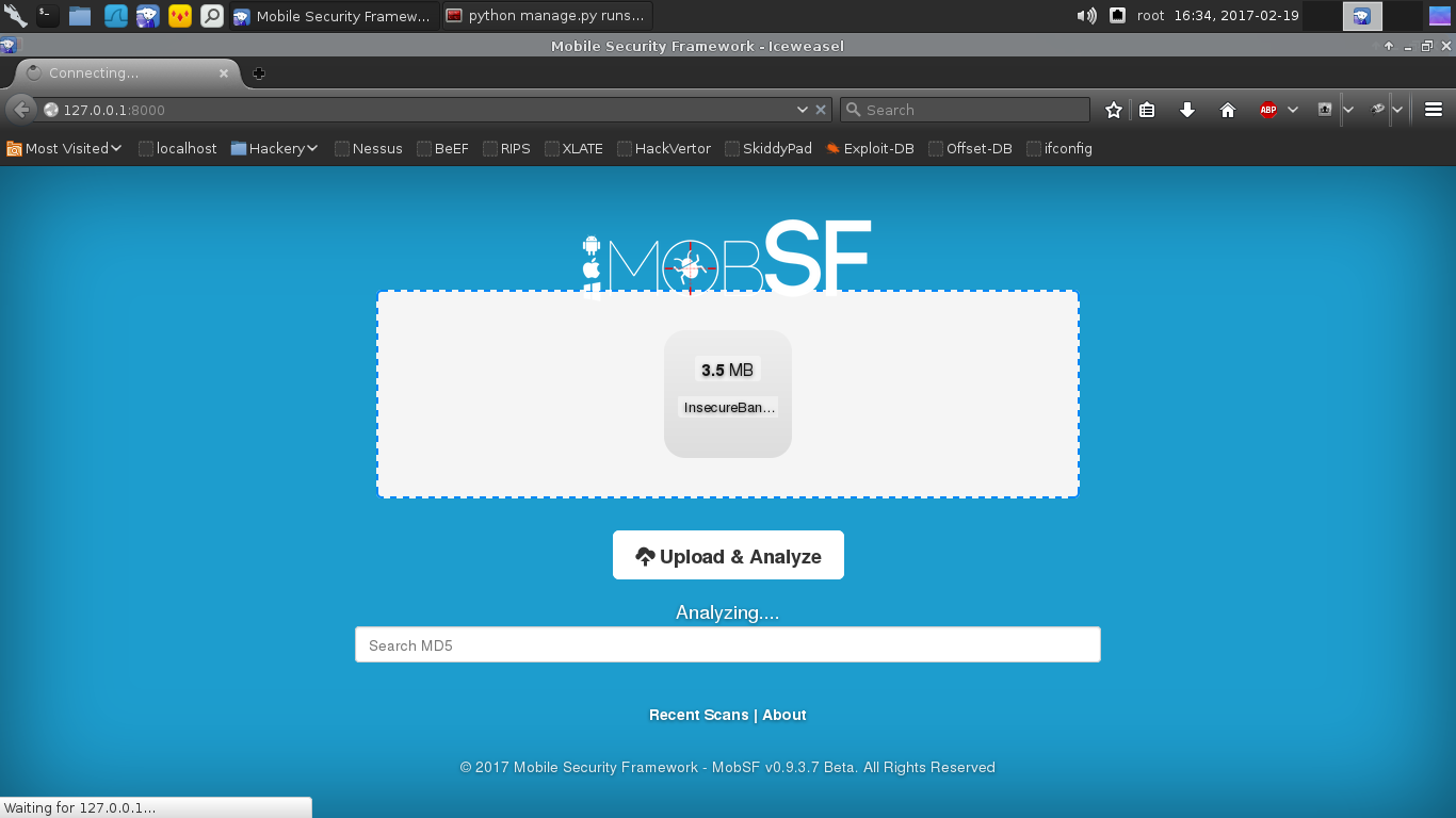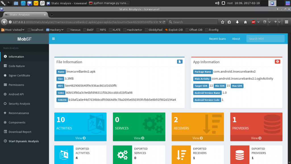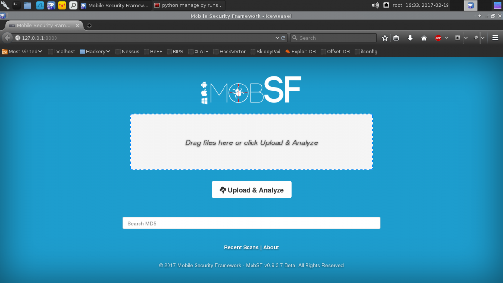 AndroBugs gibi MobSF de mobil uygulama analizi yapan bir frameworktur. Şu an en kullanışlı ve sağlam araç denebilir. Oldukça popüler ve güzel bir araçtır. Yazının başında da zaten MobSF in Android Ova sını kullanmıştık. Buraya tıklayarak MobSF in Github sayfasına ulaşabilirsiniz. MobSF i indirdikten sonra Windows, Linux ve OSX e kurabilirsiniz. Kurulum dökümantasyonu için tıklayınız. Kurduktan sonra localhostunuzda tarayıcıda çalışmakta ve apk dosyasını seçerek direk çalışmakta. Oldukça basit bir kullanımı vardır. Adres olarak 127.0.0.1:8000 adresinde çalışmaktadır.