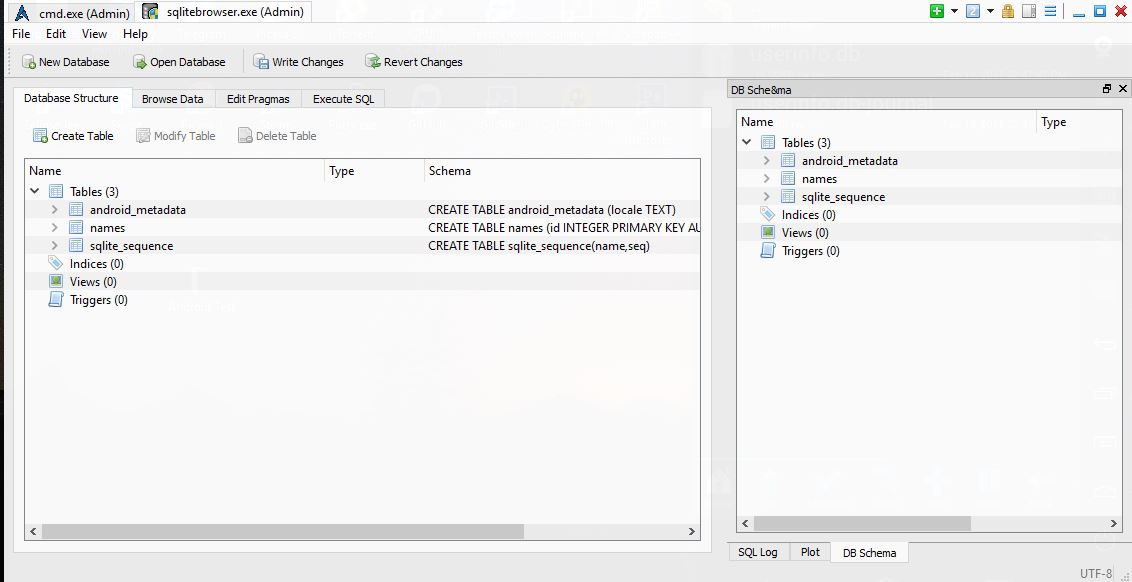 Uygulamayı cihazımıza aktardıktan sonra veritabanı dosyalarını yukarıda ADB ile kendi bilgisayarımıza indirmiştik. Bu database dosyalarının içeriğini Sqlite Browser ile görüntüleyebiliriz. Bunun dışında da Sqlite3 ile veritabanını seçerek sorgular yazıp bununla da görüntüleyebilmekteyiz.