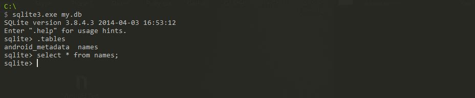 sqlite3 de ise consol üzerinden işlem yapılmaktadır. Boşluk bırakıp database dosyamızı vererek çalıştırıyoruz. Daha sonra .tables sorgusu ile veritabanı tablolarını getirebiliriz. Seçilen tabloda istediğimiz gibi sorgular çalıştrabilmekteyiz. Database dosyası şimdilik boş olduğu için hiç bir names tablosundan veri gelmedi.